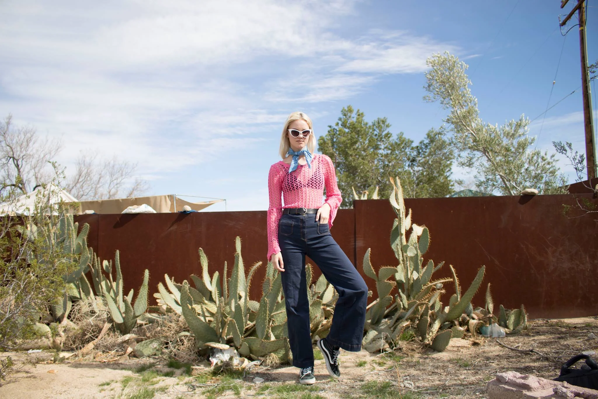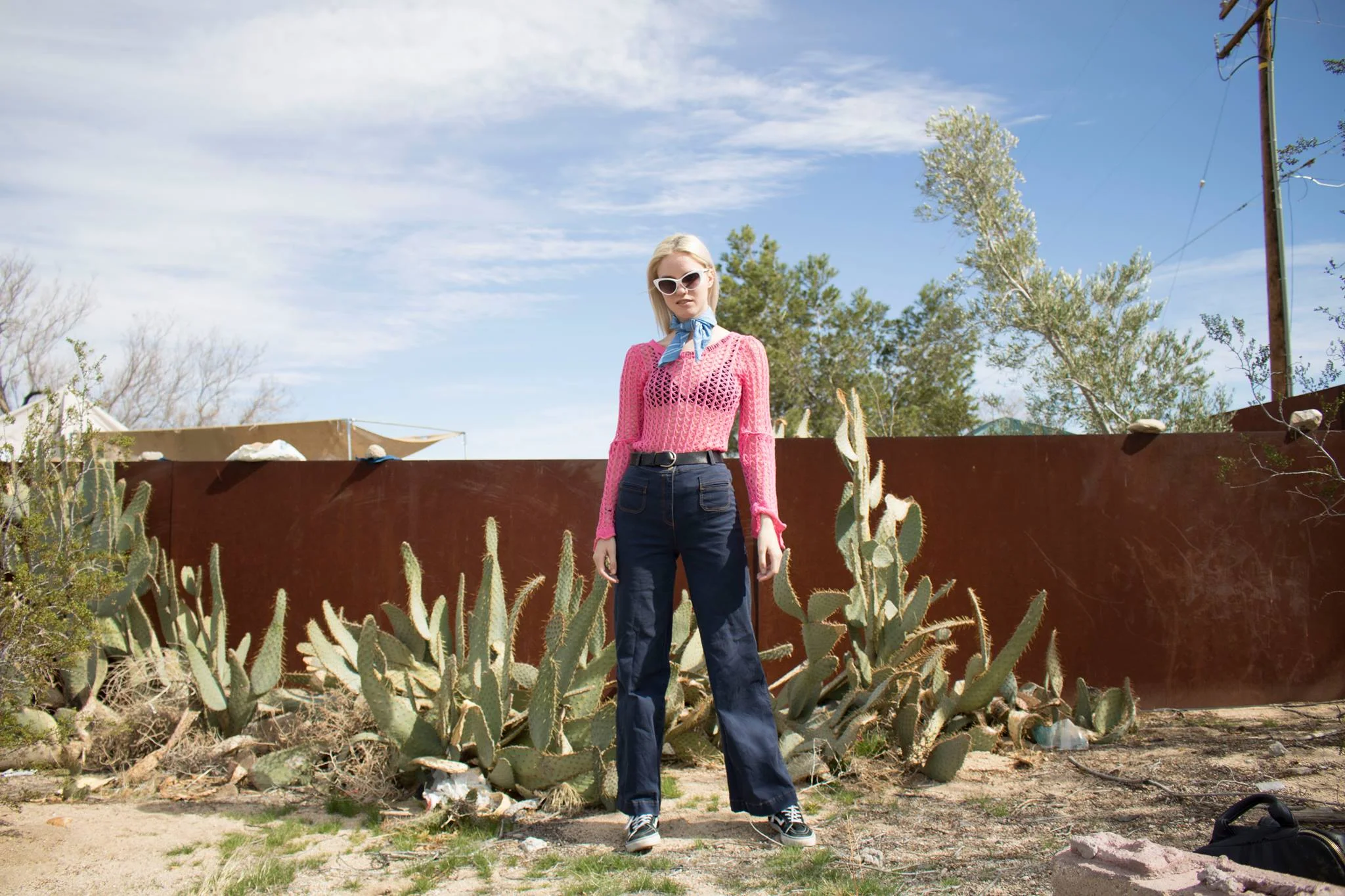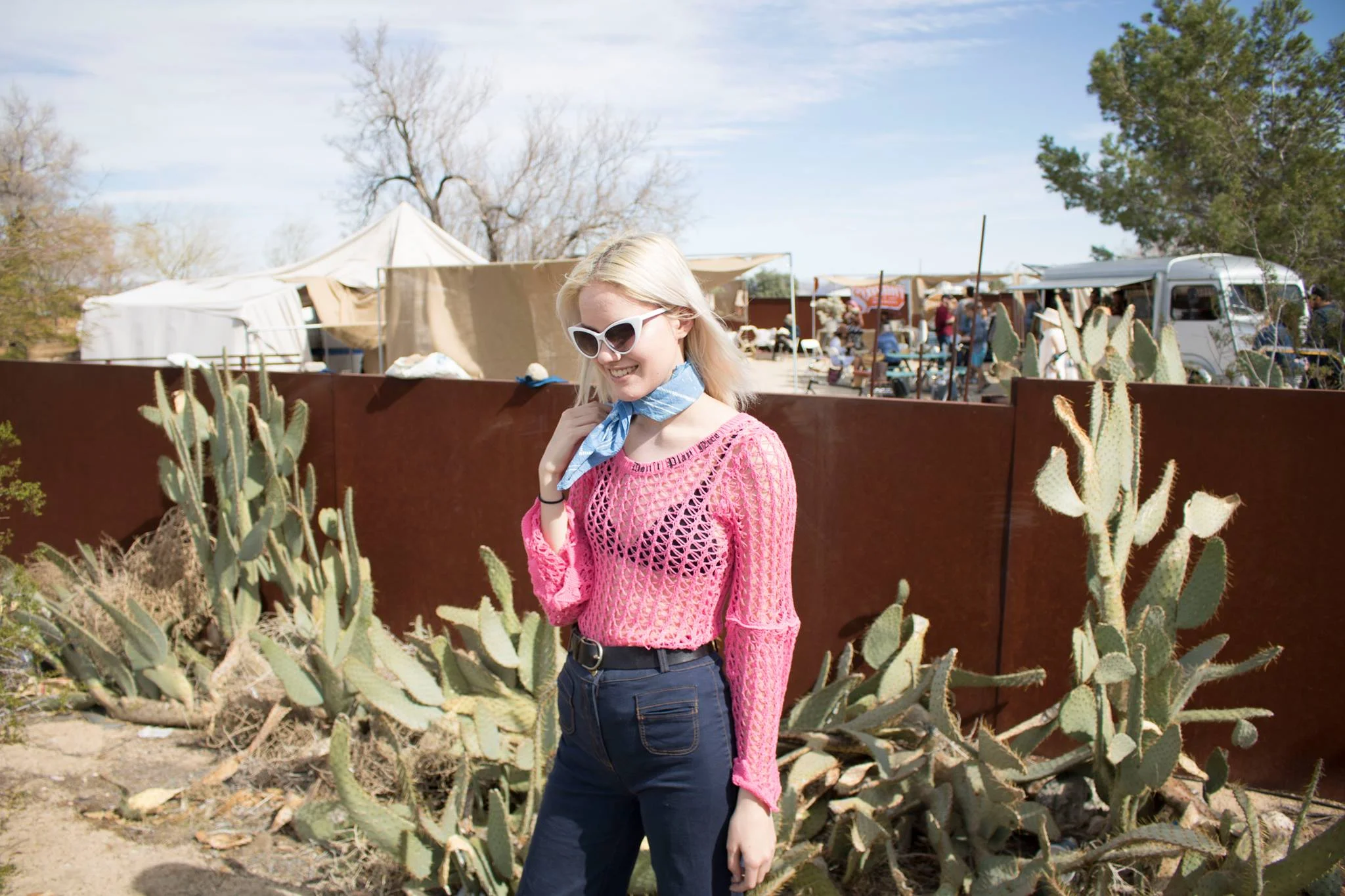Neon pink in the desert. How risqué! Of course denim and neutrals remain very classic in the great outdoors, but why not add a pop of color whilst exploring. As my outfits usually come together with no major brain proccesing, I last minute decided to pair my crotchet top from Happiness with my high waisted/wide leg jeans. During the course of the day I also added a bandana from APPRVL to complete my outfit (copped from the Desert & Denim trade show in Joshua Tree). All together I think the combination gives off an Americana vibe without feeling monotonous. What do you think?